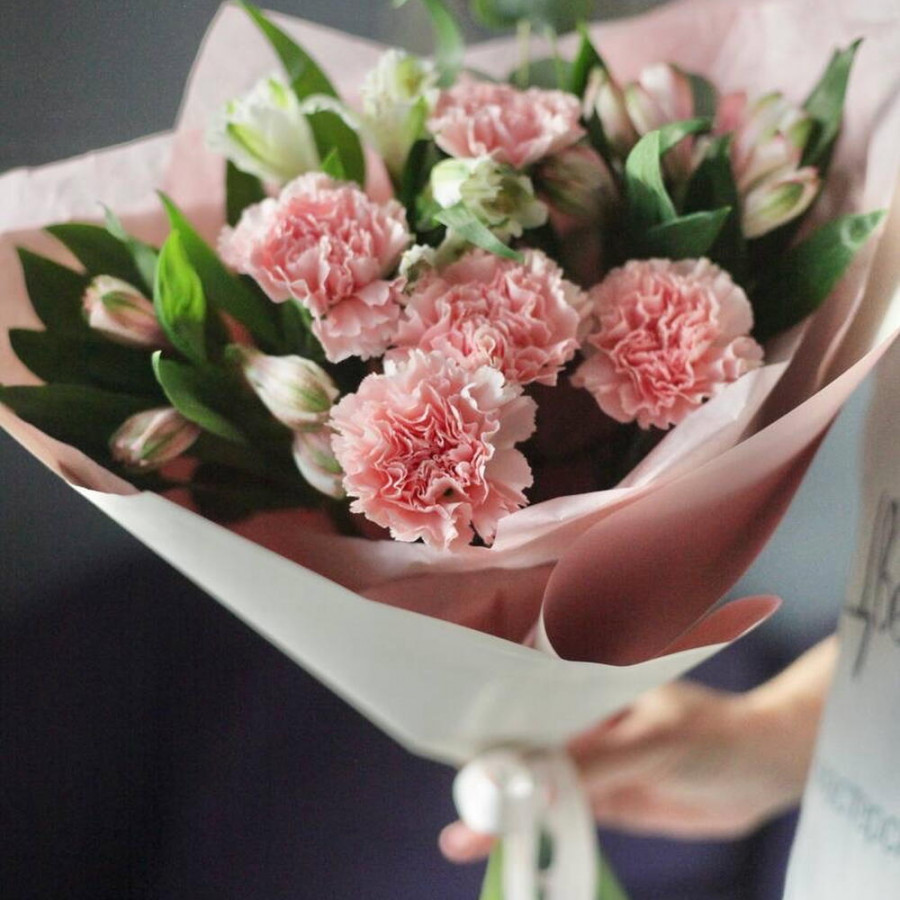 На фото букет «пудровая вуаль». В составе: альстромерия 3 шт, гвоздика 5 шт, эвкалипт 2 шт, дизайнерская упаковка 1 шт, атласная лента 1 шт, . Все цветы свежие и ароматные, букет красиво оформлен и отлично подходит для подарка. Доступна доставка цветов или самовывоз.